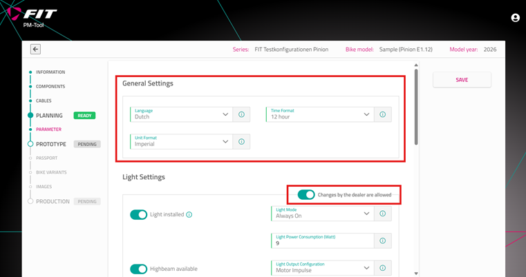 Last night there was a new cloud release. The parameter page in the PM Tool and the settings in the FIT Maintenance Tool have been revised with new setting options for OEMs and specialist dealers. PM Tool - You can now enter the default language, the time format and the date format in which the e-bike is produced.